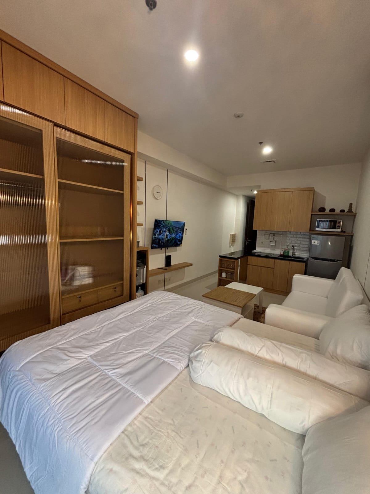 Unit studio ini sudah dilengkapi perabotan lengkap, tinggal bawa koper saja.